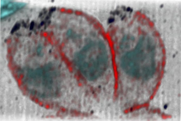 Три паразита — возбудителя токсоплазмоза. ДНК внутри каждого организма (показана синим и зеленым) окружена мембраной (красным) и белком (черным). Паразитические протисты достигают десяти микрон в диаметре.