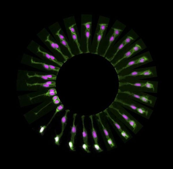 Деление стволовой клетки в мозге рыбы данио-рерио. По мере движения по часовой стрелке видно, как клетка делится на нервную (превращается из фиолетовой в белую) и такую же стволовую (остается фиолетовой). Весь процесс (до полного разделения клеток) занимает около девяти часов.
