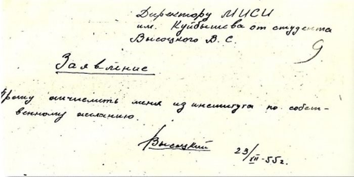 Заявление Высоцкого об отчислении из МИСИ, 1955 год, Москва