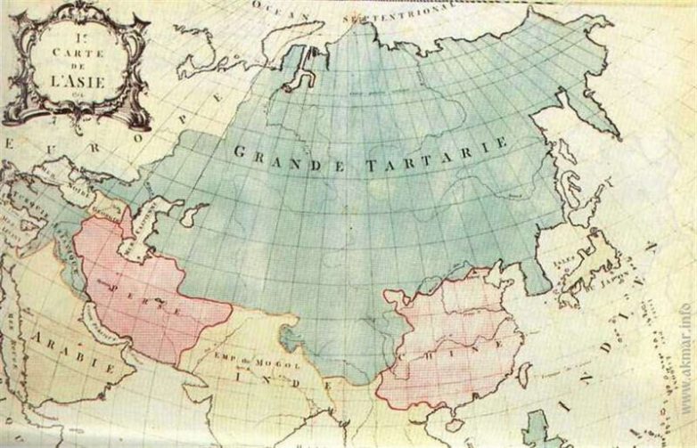 «Тартария, громадная страна в северной части Асии, граничащая с Сибирью на севере и западе, которая называется Великая Тартария. Тартары, живущие южнее Московии и Сибири, называются Астраханскими, Черкасскими и Дагестанскими, живущие на северо-западе от Каспийского моря, называются Калмыкскими Тартарами и которые занимают территорию между Сибирью и Каспийским морем; Узбекскими Тартарами и Монголами, которые обитают севернее Персии и Индии и, наконец, Тибетскими, живущие на северо-запад от Китая»