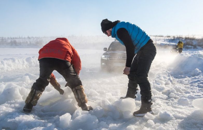Если тут запуржит — это очень плохо. В считанные минуты дорогу, вернее направление, по которому едут машины, занесёт и таким машинам как наши, будет невероятно сложно пробиться хоть куда-нибудь. Этот участок по морю считается самым опасным именно из за пурги, самым непредсказуемым. На обратном пути из Тикси мы поняли насколько нам повезло. Ночью, пока наша команда отдыхала в гостинице, дул очень лёгкий ветерок, но и его хватило что бы на дороге появились перемёты — частые сугробы. Если бы не отправленая вперёд шишига (Газ-66), пробившая в некоторых местах нам дорогу, пришлось бы покопать.