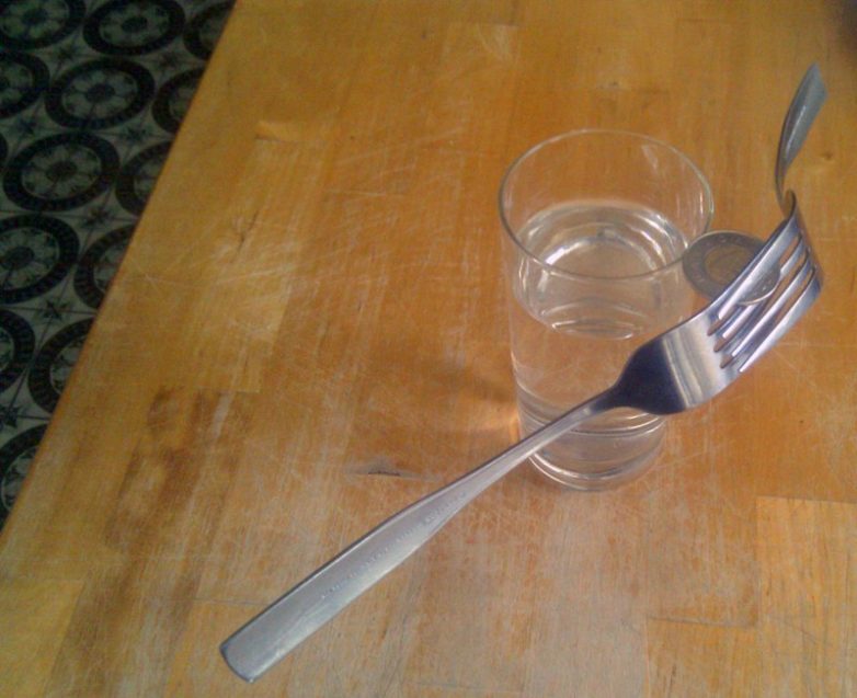 Центр тяжести конструкции находится на стороне вилки, а не стакана, поэтому по логике вилка должна опрокинуться монетой вверх.