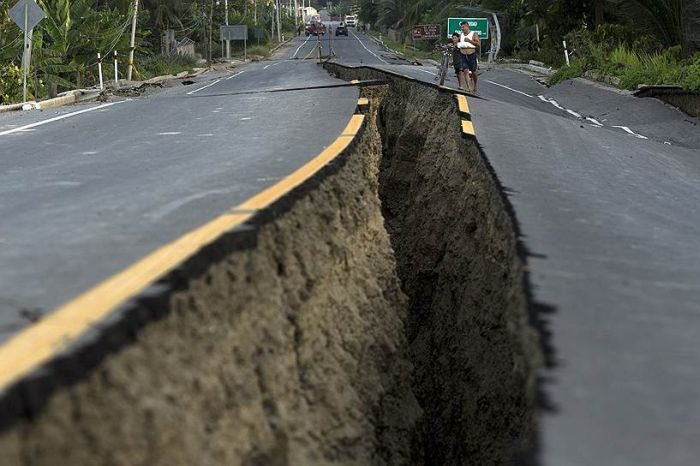 Трещина в шоссе, образовавшаяся в результате разрушительного землетрясения в Эквадоре