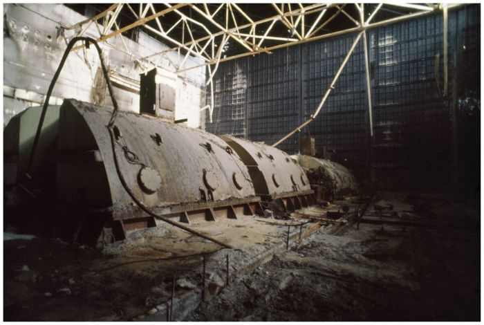 Машинный зал 4-го блока. Световые лучи получились от дырок в саркофаге