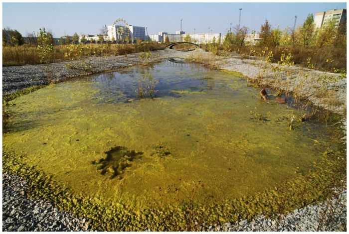 Заброшенный пруд с видом на колесо обозрения, которое уже никогда не будет работать. Цвет пруда говорит только о ряске и не имеет к радиации никакого отношения