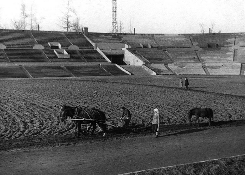 Подготовка футбольного поля стадиона «Динамо» к сезону после реконструкции. Москва. 1935 год. Из архива музея общества «Динамо».
