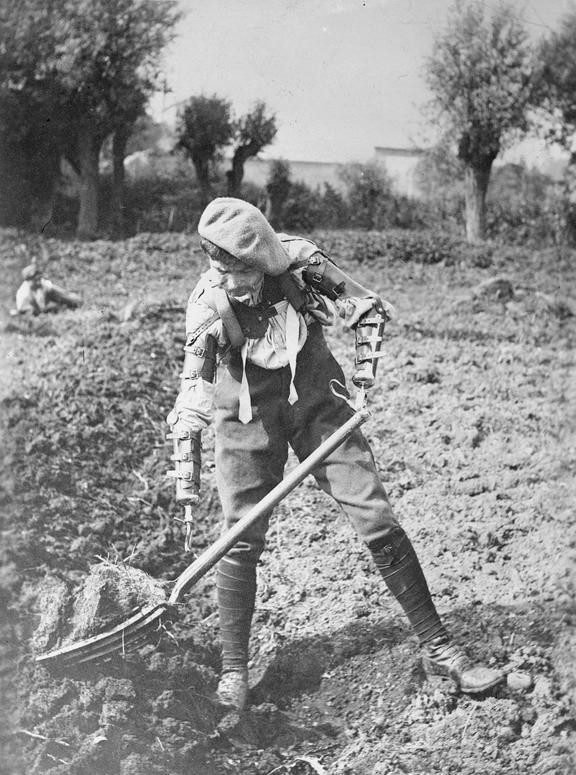 Раненый британский солдат, которому ампутировали обе руки по локоть, работает на ферме, Франция, 1918 г.