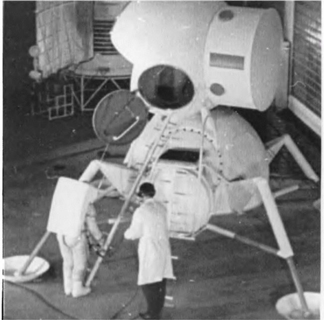 В. Бугров отрабатывает выход на поверхность Луны на макете лунного модуля, 1960–е годы, СССР