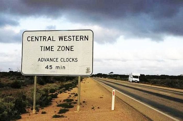 16. Континентальная часть Австралии находится в трёх часовых поясах: Западное стандартное время (UTC+8), Центральное стандартное время (UTC+9:30) и Восточное стандартное время (UTC+10). Но есть места (некоторые деревни) в Западной Австралии, где разница во времени составляет не час или два (как в Европе), а всего 15 минут.