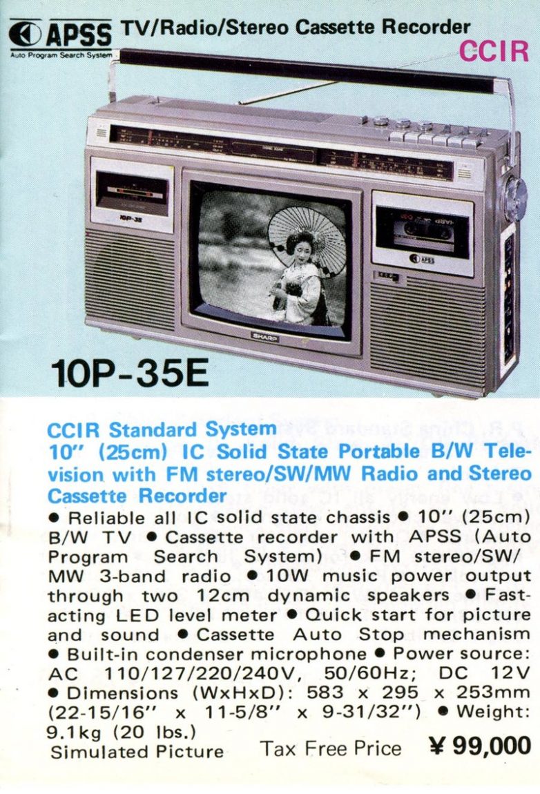 Вот такой агрегат выпускала фирма Sharp в конце 1970-х годов. Портативный черно-белый телевизор, радиоприемник и кассетный магнитофон в одном флаконе.