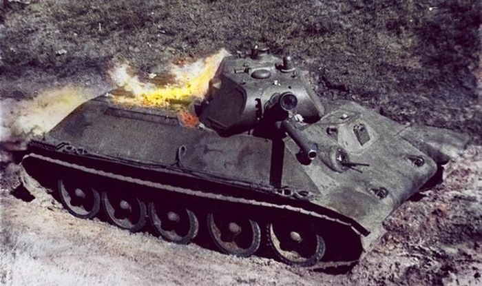 Советский танк Т-34 (до принятия в серийное производство — А-34) на испытаниях. Забрасывание моторного отсека бутылками с горючей смесью.