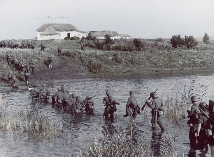 Группа немецких пехотинцев переходит вброд речку в деревне на Восточном фронте.