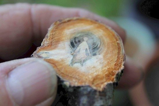 Неожиданный инопланетянин на спиленной ветке абрикосового дерева