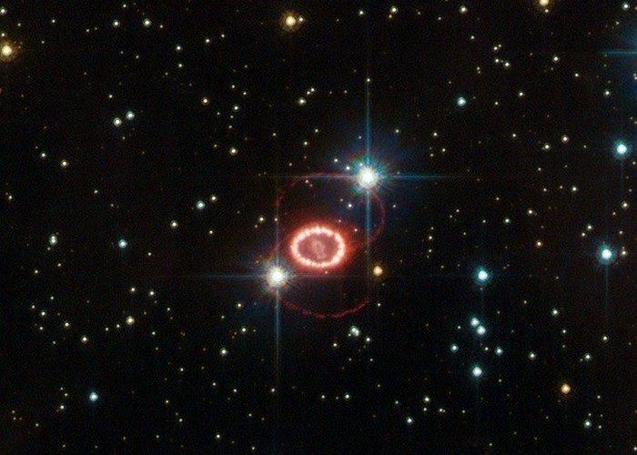 Это изображение показывает взрыв сверхмассивной звезды, который больше похож на торт ко дню рождения, чем на сверхновую. Две петли из остатков звезды простираются неравномерно, в то время как кольцо в центре окружает умирающую звезду. Ученые до сих пор ищут нейтронную звезду или черную дыру в центре бывшей гигантской звезды.