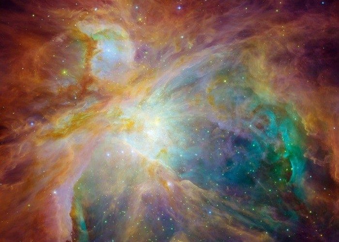 На данном снимке туманность Ориона похожа на открытый рот птицы Феникс. Снимок сделан в инфракрасном, ультрафиолетовом и видимом свете, чтобы создать невероятно красочное и детальное изображение. Яркое пятно на месте птичьего сердца — четыре гигантские звезды, примерно в 100 000 раз ярче Солнца.