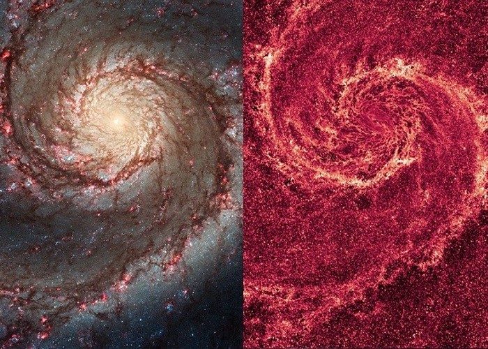 Хотя галактика Водоворот выглядит великолепно, она скрывает в себе темную тайну (в буквальном смысле) — галактика полна хищных черных дыр. Слева Водоворот показан в диапазоне видимого света (т. е., ее звезды), а справа — в инфракрасном свете (его структуры пылевых облаков).