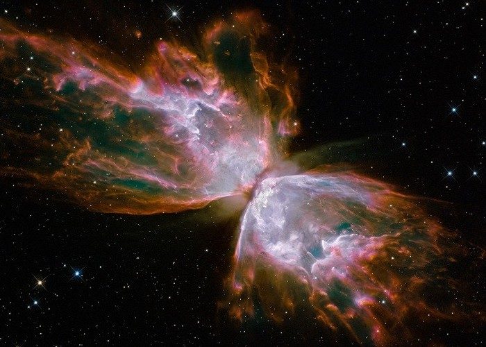 Неофициально известная как Туманность Бабочка, NGC 6302 на самом деле является остатками умирающей звезды. Ее ультрафиолетовое излучение приводит к тому, что выброшенные звездой газы ярко светятся. Крылья «бабочки» простираются более чем на два световых года, т. е. на половину расстояния от Солнца до ближайшей звезды.