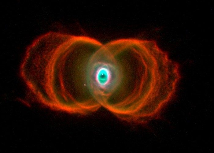 В результате взрыва звезды, похожей на наше Солнце, образовалась туманность Кольцо — красивые раскаленные слои газа и остатки атмосферы. Все, что осталось от звезды, — маленькая белая точка в центре картинки.