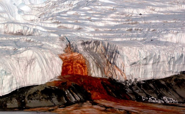 Самый настоящий водопад крови падает в одном из самых засушливых районов Антарктиды. Он питается подземным озером, воды которого полны бактерий — ученые прикладывают все усилия, чтобы изучить их досконально. Эти бактерии подпитываются сульфатами, а не сахаром, как большая часть живых организмов планеты. Здесь содержится так много железа, что вода буквально ржавеет в воздухе.