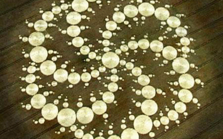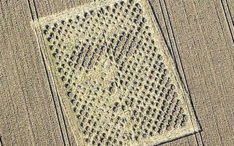Эта прямоугольная композиция с человеческим лицом возникла в августе 2001 года рядом с радиотелескопом в Чилболтон, Гемпшир. Не имея никаких признаков участия человека в его создании, образование до ужаса напоминало знаменитое лицо на Марсе и сопровождалось вторым образованием, которое содержало сложный двоичный код. Закодированная информация, что интересно, удивительно похожа на ту, что мы отсылали в космос на космическом аппарате Вояджер.