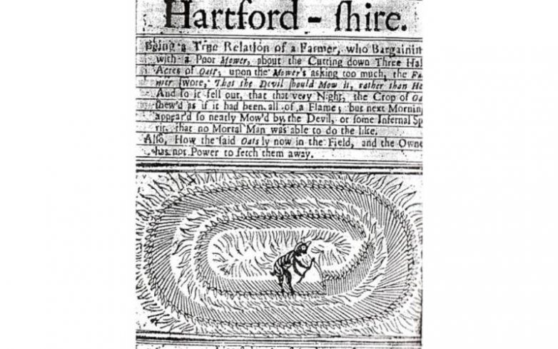 Самое раннее упоминание о кругах на полях относится к загадочной истории, приключившейся в 1678 году однажды ночью в Хартфордшире. Газетная статья о таинственном явлении была опубликована 22 августа под заголовком «Дьявольский косильщик или странные новости из Хартфордшира».
