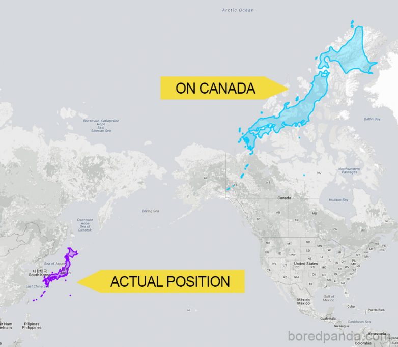 Сайт thetruesize.com позволяет пользователям менять расположение участков суши, чтобы продемонстрировать, как они заблуждаются по поводу реальных размеров стран. Немного проиграв с этой функцией, легко обнаружить следующее: