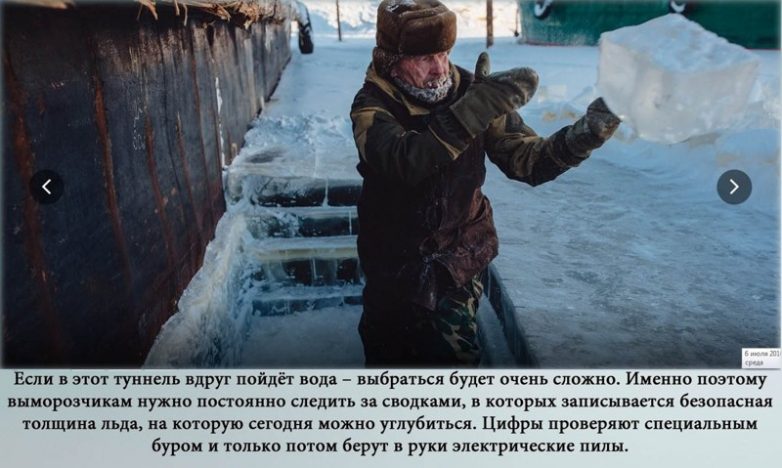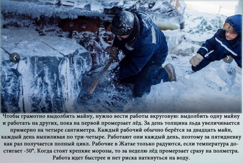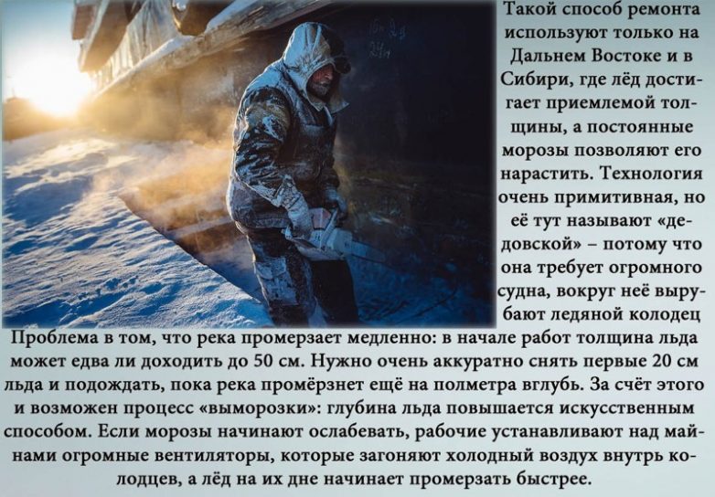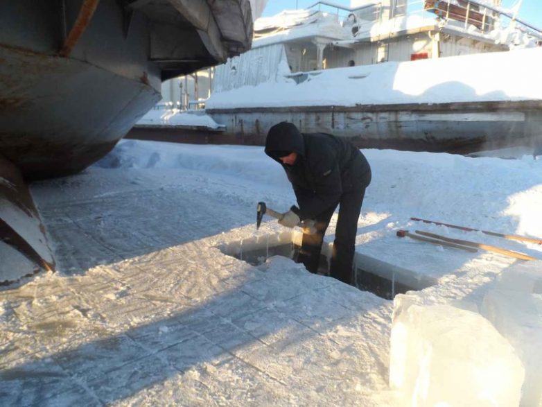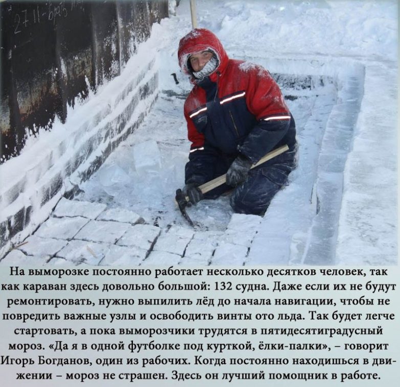 На судоремонтном заводе в Жатае для ремонта кораблей у них под днищем строят целые лабиринты во льдах: уникальный метод ремонта называется «выморозкой». В пятидесятиградусные морозы рабочие высвобождают суда из замёрзшей реки с помощью электропил, буров и молотов. Для мужчин работа, короче…