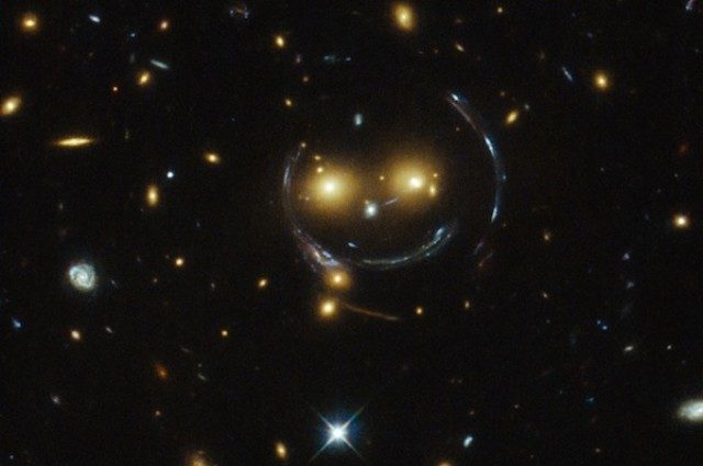 Подобные «смайлы» возникают в космосе благодаря тому, что свет далеких галактик часто проходит на пути к Земле через набор гравитационных «линз» — уголков космоса, где сила притяжения массивных объектов, темной материи или галактик, искривляет лучи света.