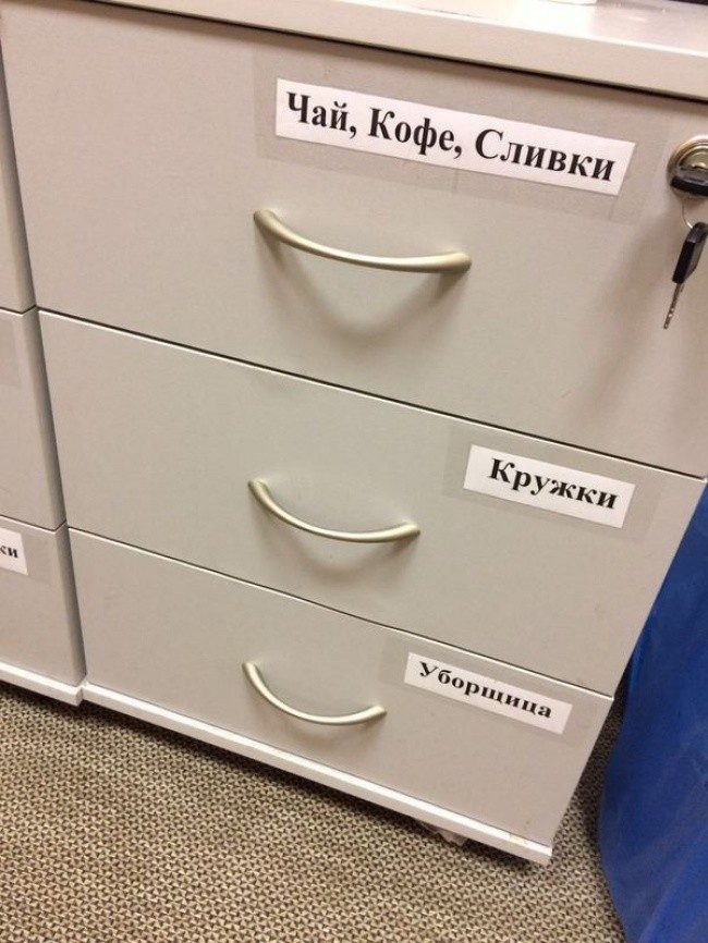 Ха! Подписанные ящики в тумбочке! Этого каждый день навалом! Называется ПСР (Производственная система Росатома). А на столе еще разметка и должно быть подисано, где должны располагаться телефон, карандашница, календарь, ручка, принтер…