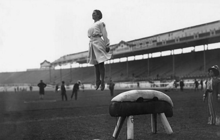 Прыжок через козла (на самом деле это конь) какой-то слишком фантастический по высоте, учитывая отсутствие мостика для толчка ногами. А руками от лежащего на коне тюфяка так не оттолкнешься.