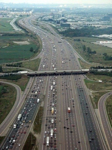 Самое широкое шоссе в мире находится в Онтарио, Канада. В самом широком месте эта трасса насчитывает 22 полосы.