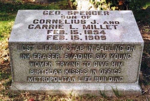 «Погиб, упав и напоровшись на скребок для чернил, когда убегал от шести девушек, пытавшихся поцеловать его в честь дня рождения в офисе Метлайф-Билдинг»