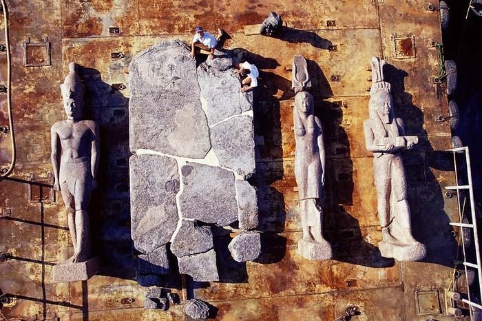 Рядом с разрушенными стенами археологи нашли три огромных статуи из розового гранита, которые предположительно рухнули во время землетрясения. Две статуи изображают неизвестного фараона и его супругу. Третья статуя — Хапи, египетского бога разлива Нила.