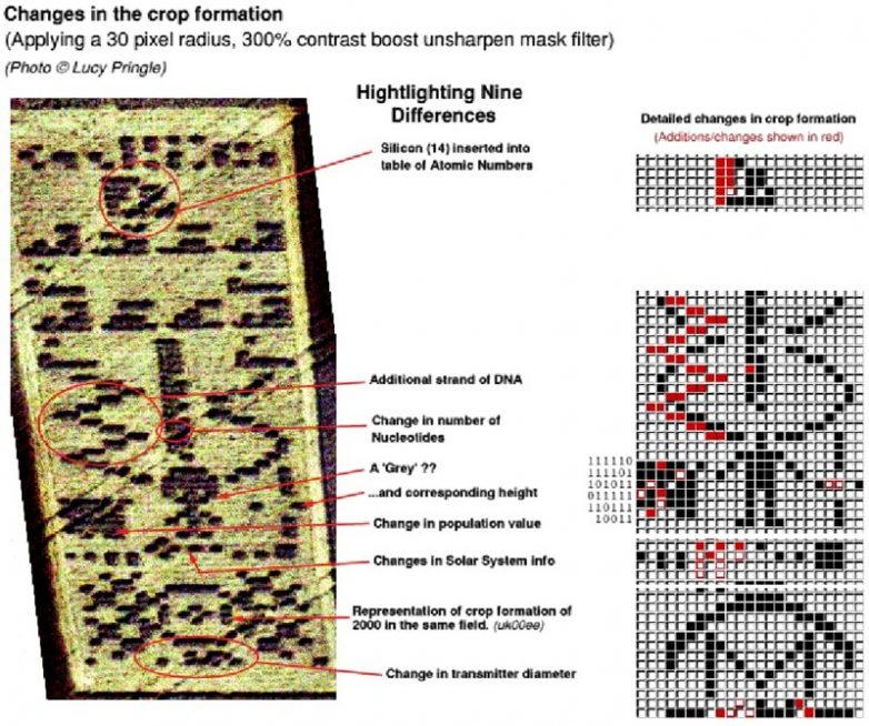 Но вот что интересно: в 2001 году на земле рядом с обсерваторией Чилболтон появилось изображение, один в один напоминающее послание Аресибо. Правда, было все же небольшое отличие в диаметре микроскопа, информации о Солнечной системе, данных о человечестве, ДНК и еще кое-каких моментах. Будто бы это было ответом на нашу шифровку с рассказом инопланетных существ о том, кто они такие. Что ж… послание в Чилболтоне выглядит огромным и весьма специфическим. И либо это знак свыше и отправители не пользовались Почтой России для доставки ответа, либо кто-то не поленился пошутить с размахом на несколько гектаров.