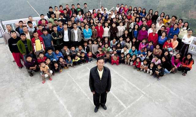 Зиона Чана является главой самой большой семьи в мире. У него 39 жен, 94 ребенка и 39 внуков. Они живут в 4-этажном 100-комнатном доме в деревне Бактванг в штате Мизорам.