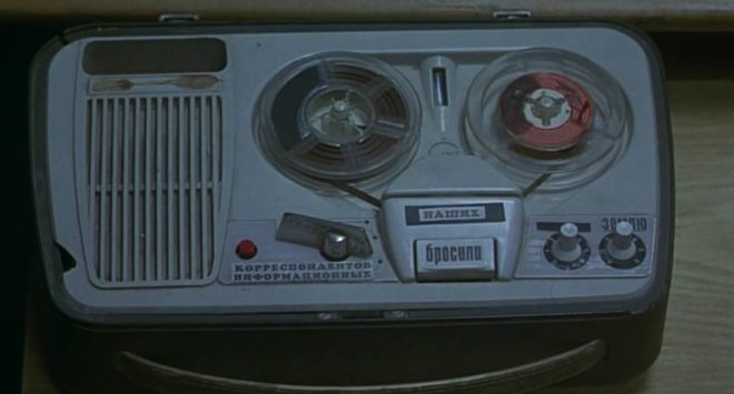 Время действия — 1982 год. Но вообще шифровки и разные сообщения принято записывать на ленту, а не на проигрывающий ее аппарат.