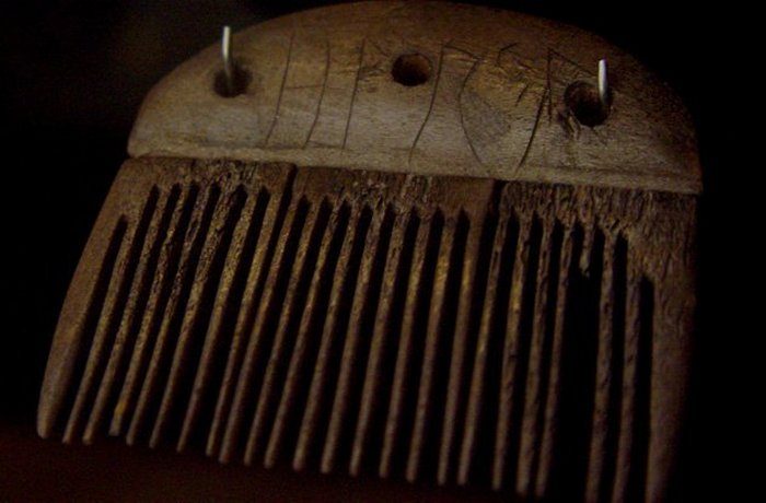 Одной из наиболее древних считается руническая надпись, обнаруженная на гребне из оленьего рога, найденном в Вимосе на острове Фюн в Дании. Надпись рунами на нем гласит «Harja», что может означать имя. Древний гребень сейчас хранится в Дании, в Национальном музее. Специалисты полагают, что он мог принадлежать скандинавскому воину, который носил его, скорее всего, в специальном кожаном кошельке, прикрепленном к поясному ремню.