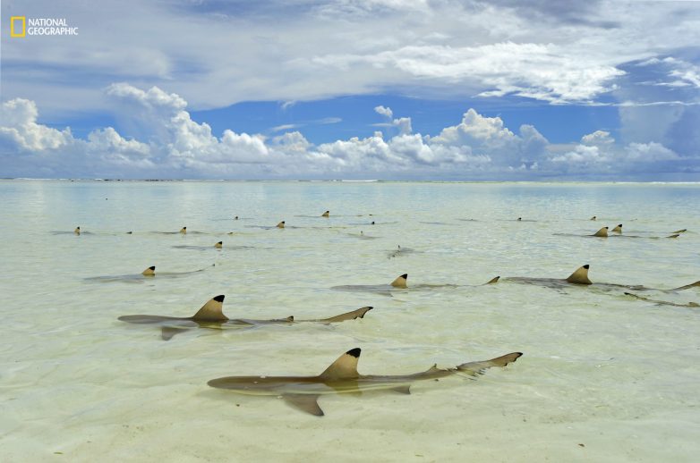24. Черноперые рифовые акулы во время отлива на Сейшеллах (Thomas P. Peschak / National Geographic)