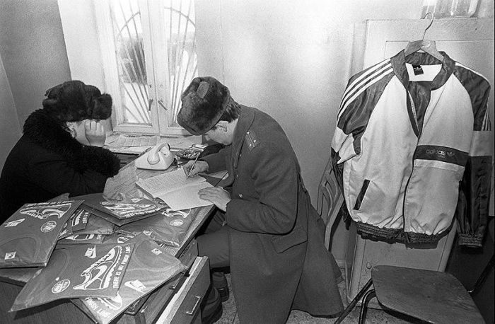 Пойманный фарцовщик с товаром в отделении милиции, 1980–е годы, СССР