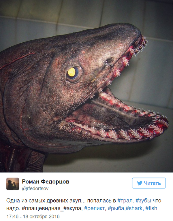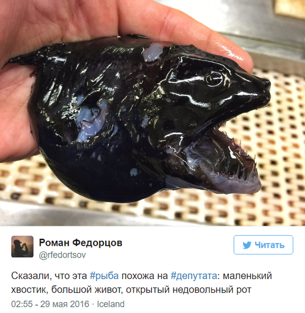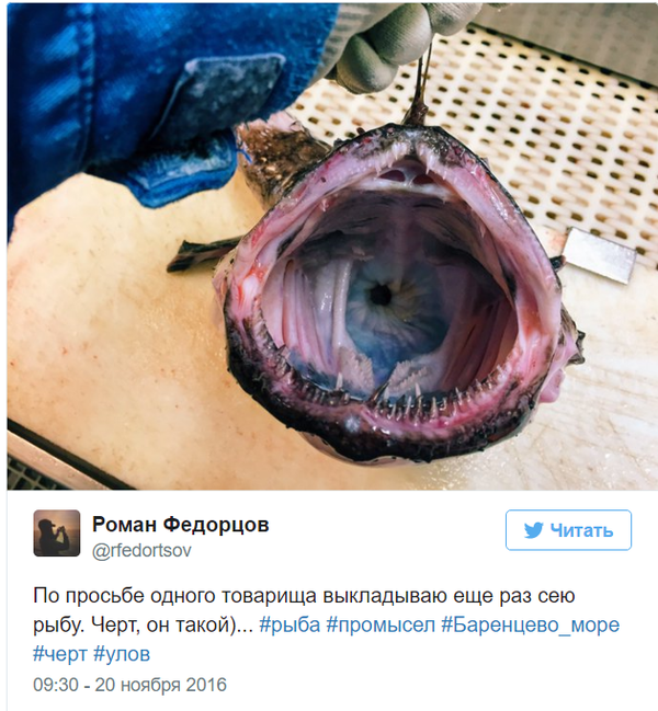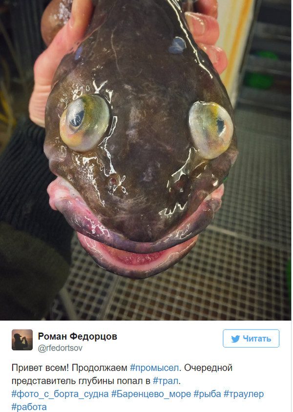 Пользователь твиттера Роман Федорцов, работающий на рыболовецком траулере, выкладывает в свой микроблог фотографии необычных рыб, попадающих в сети судна. В его коллекции десятки различных снимков из разных частей света.
