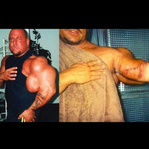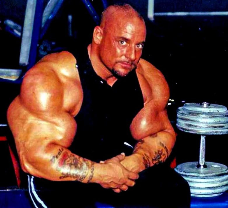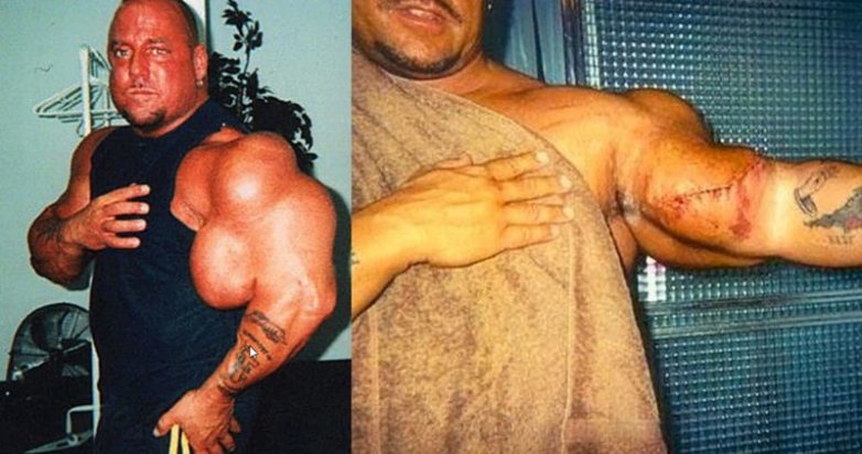 Огромные бицепсы — мечта многих, именно она приводит в залы начинающих культуристов. Бицепс Арнольда Шварценеггера в период активных тренировок — 54–57 сантиметров. Бицепс Дориана Йейтса — 54 сантиметра. И хотя многие (в том числе Стюарт Макроберт, автор методики по наращиванию массы) полагают, что эти обмеры — фейк и что их завышают сами культуристы в погоне за славой, 50-сантиметровые руки — это без преувеличения главный фетиш бодибилдинга. Американский качок Грег Валентино пошёл дальше и сделал себе руки в 69 сантиметров! Он похож на раздувшегося Халка, и «жертва культуризма» — явно о нем.Он стал качаться в начале 1980-х, и с руками у него все было в порядке — 47 сантиметров, если верить его собственным словам. Но в 1990-х Валентино открыл для себя препарат «Синтов» — это масло, которое колют в мышцу. Масло остаётся между пучками мышечных волокон, и из-за этого мышца кажется больше. Препарат-предшественник «Синтола» под названием «Эсиклен» был известен культуристам уже в начале 1980-х, но «Эсиклен» внутри тела распадался очень быстро, и уже через сутки мышца вновь принимала свой обычный вид. А в 1992 году появился «Синтол» — после инъекций мышца оставалась раздутой три-пять, а иногда и больше лет. Чем больше инъекций — тем больше объём мышцы. Курс, который позволяет вырастить 70-сантиметровые руки, включает около 200 инъекций в каждый бицепс.