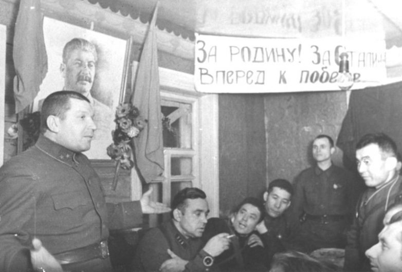 Новогоднее собрание бойцов и командиров 1073-го стрелкового полка 8-ой гвардейской им. Панфилова стрелковой дивизии в деревне Крюково под Москвой. Крайний слева, предположительно, командир 8-й гвардейской дивизии генерал-майор В.А. Ревякин.