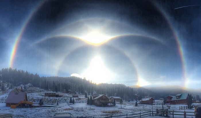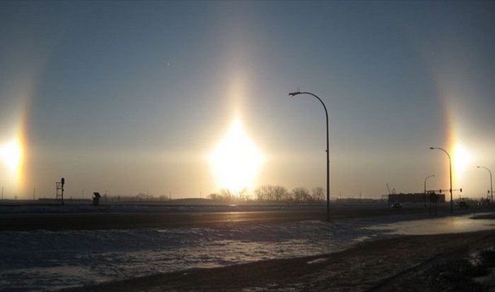 Эта иллюзия известна, как «ложное солнце». А происходит подобное явление, когда кристаллы льда в атмосфере создают эффект двух дополнительных солнц по обеим сторонам от настоящего солнца.