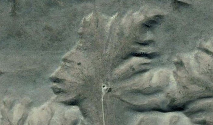 Это скальное образование в канадской провинции Альберта можно увидеть на Google Earth. Сверху горы выглядят, как голова человека, одетого в головной убор канадских аборигенов. Более того, горы выглядят так, будто «индеец» то ли в серьгах, то ли с наушниками.