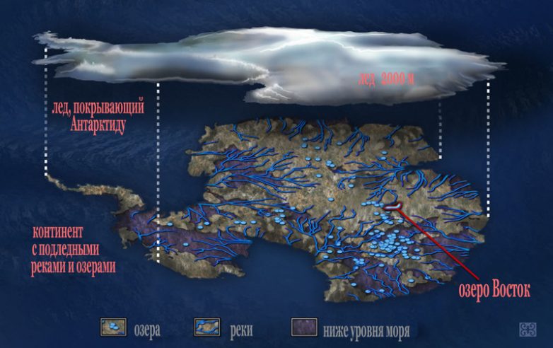 Всего в Антарктиде обнаружено более 140 подледниковых озёр. Но самым известным из них является озеро Восток, расположенное вблизи советской, а позднее российской антарктической станции «Восток», которая и дала озеру своё название. Над озером находится четырёхкилометровая толща льда, но само оно, благодаря располагающимся под ним подземных геотермальным источникам не замерзает. Температура воды в глубине озера находится на уровне 10°C. Именно это толща льда по предположениям учёных могла послужить естественным изолятором, сохранившим уникальные живые организмы, которые все эти миллионы лет развивались и эволюционировали совершенно обособлено.