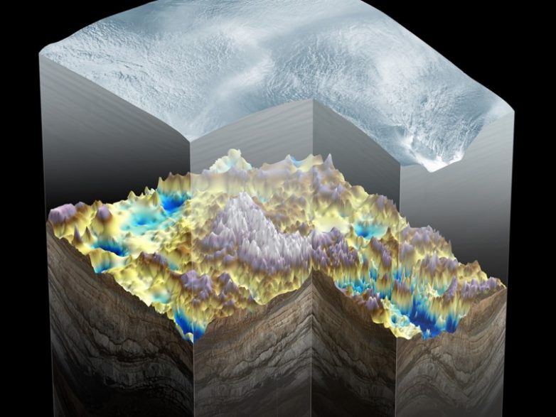 Эти горы называются Горы Гамбурцева по фамилии советского геофизика и академика Георгия Гамбурцева, чья экспедиция в 1958 году и открыла их существование. Длинна горного массива составляет 1300 км, ширина — от 200 до 500 км. Наивысшая точка — 3390 м. Ну а теперь самое интересное: вся эта громадина покоится под огромной толщей льда. В среднем толщина ледового покрова над горами составляет 600 метров, но попадаются участки, где толща льда более 4 км.