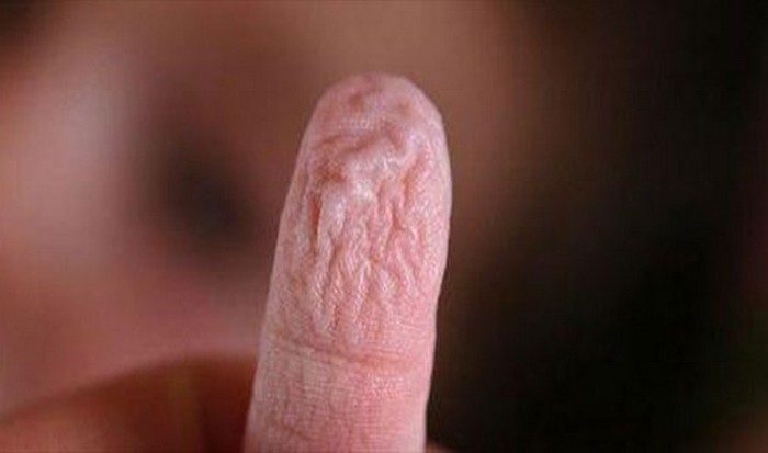 Если опустить пальцы в воду, то кожа на них сморщивается. Принято считать, что это происходит потому, что кожа впитывает воду. На самом деле, кожа сморщивается, потому что она «получает команду от мозга» делать это. Почему поступает такая команда — не знает никто.