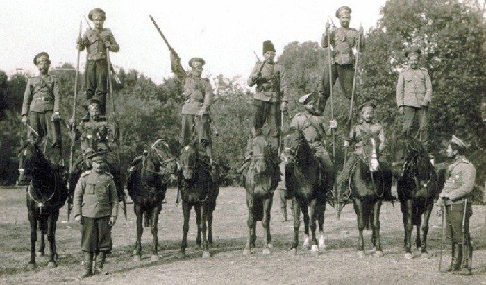 Тренировки казаков по преодолению препятствий на конях, 1910 год.