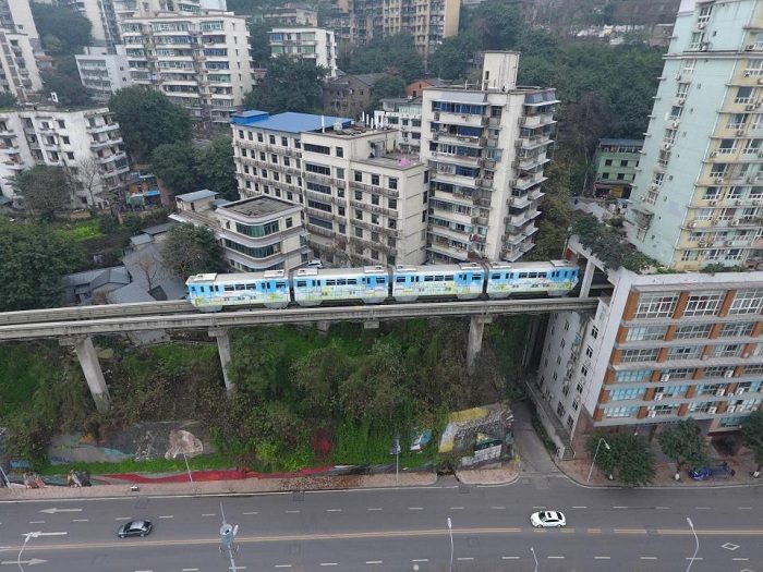В китайском мегаполисе Чунцин чрезвычайно плотная застройка делает практически невозможной реализацию новых архитектурных или инженерных проектов. Поэтому проектировщикам порой приходится принимать довольно экстремальные решения. Так, в одном из районов города можно увидеть, как монорельс проходит прямо сквозь 19-этажный жилой дом.