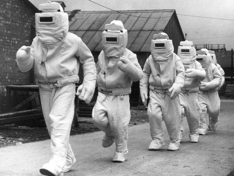 Демонстрация асбестовых скафандров для наземной пожарной службы аэропорта, Великобритания, 14 октября 1940 года.